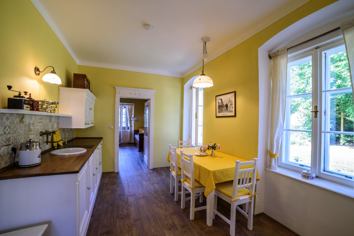 Pro váš dokonalý komfort je dobová atmosféra citlivě doplněna i řadou výdobytků moderní doby jako je TV s internetem, indukční varná deska, mikrovlnná trouba s grilem, lednice, rychlovarná konvice, kávovar a wifi.